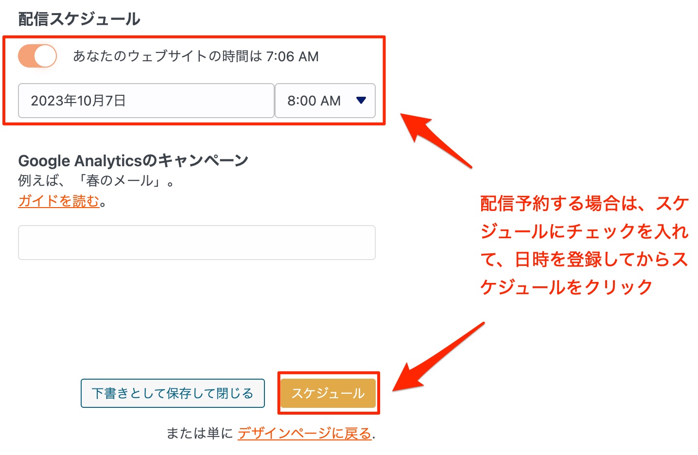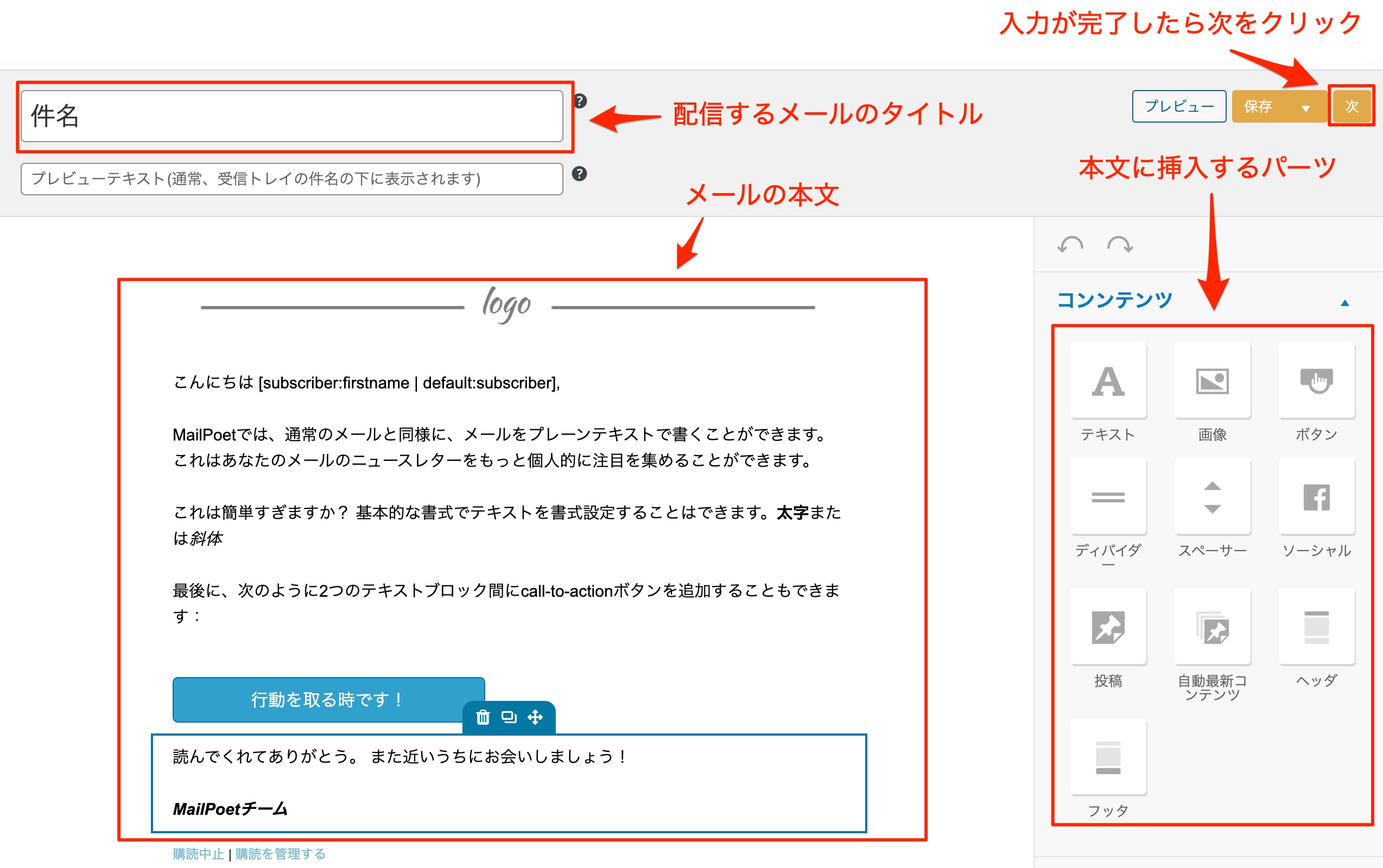 選択した雛形の本文を編集し、タイトルを入力したら【次】をクリックし、続いて配信の設定を行います。