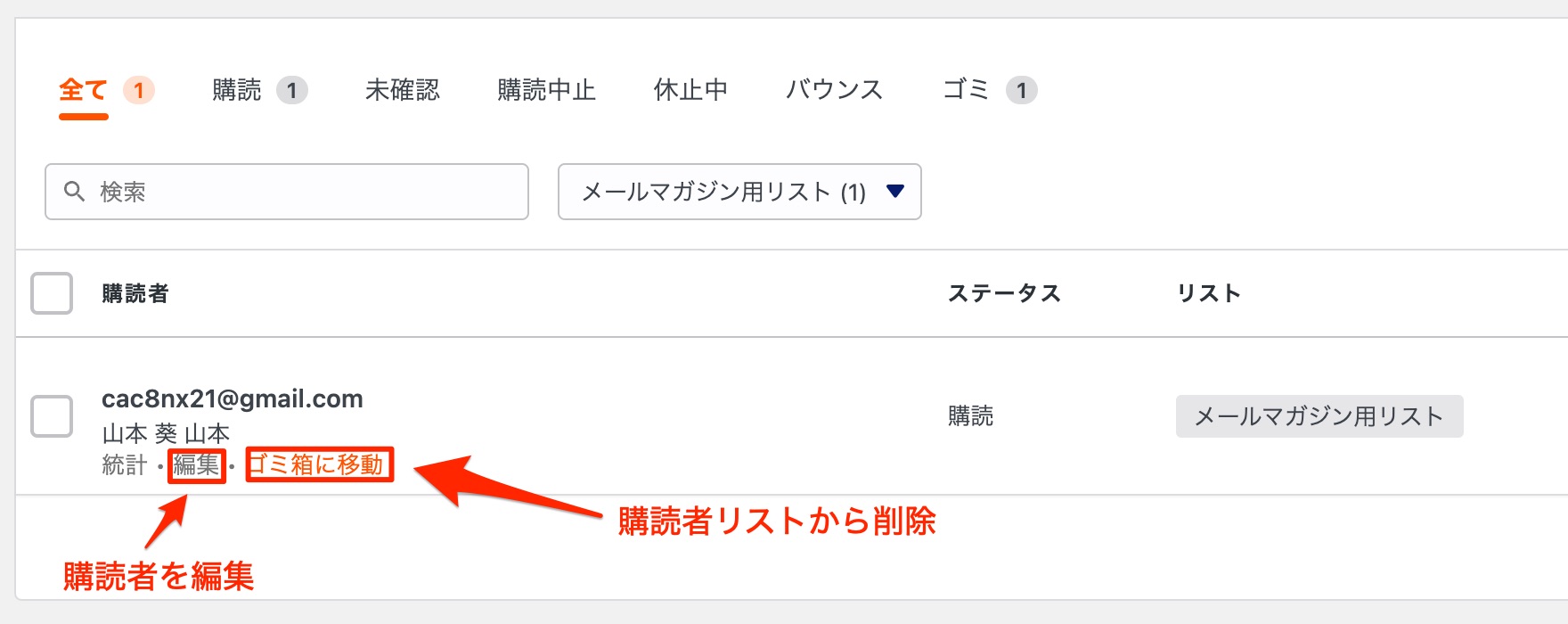 運営者はメールマガジン購読者の一覧を表示し、必要に応じて購読者の情報を編集したり、購読者リストから削除することができます。