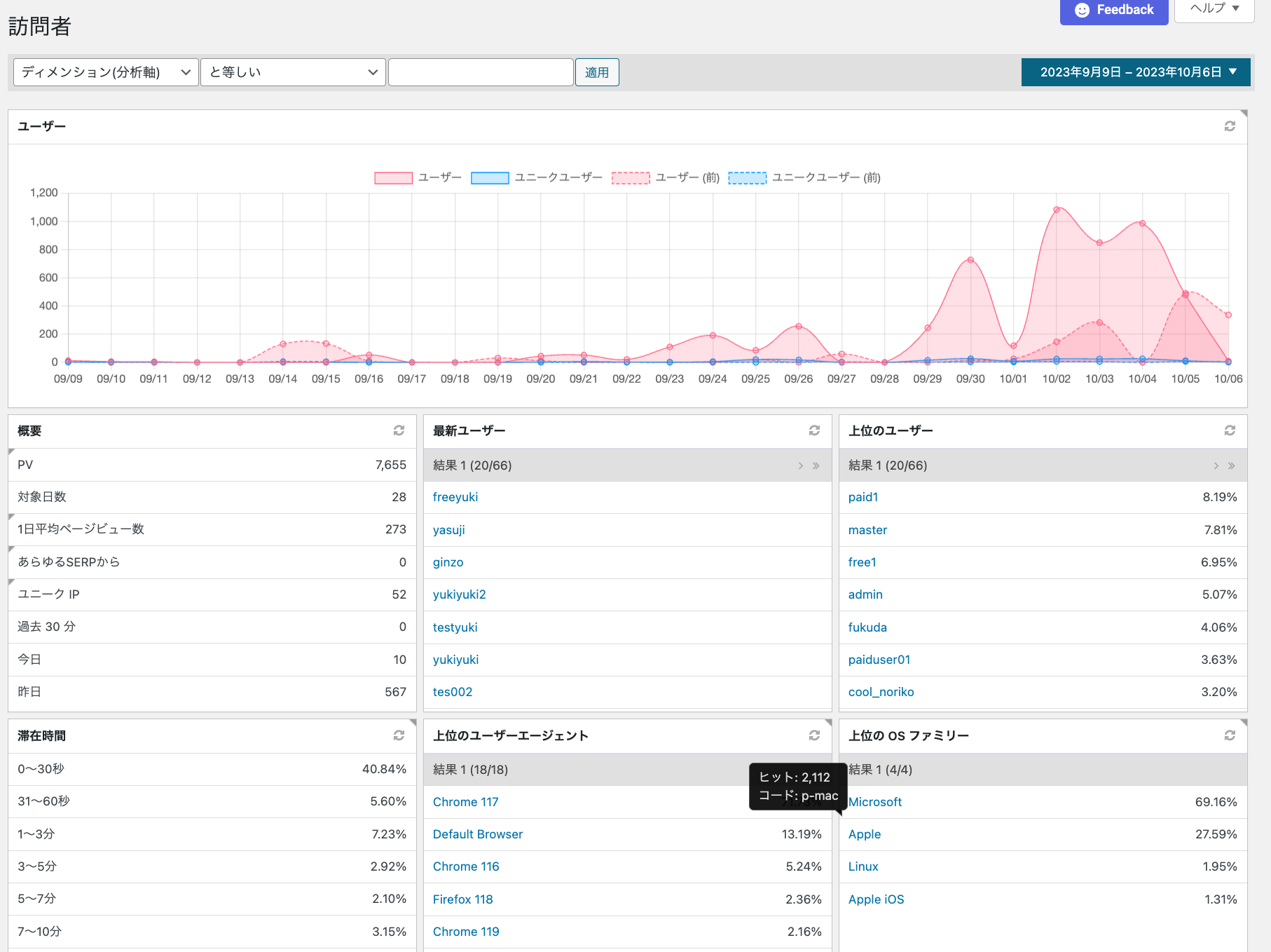 現在、リアルタイムでアクセスしているユーザーを表示します。背景色がオレンジ色が管理者、緑色が会員、水色が非会員です。それぞれがどのページにアクセスしたのかも表示されます。これにより現在のアクセス状況を把握することができます。